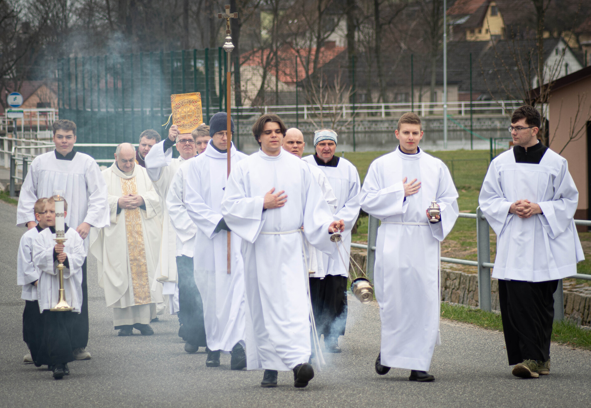 Duchovní program probíhal v areálu svatyně od ranních hodin. Dopoledne se věřící modlili Korunku k Božímu milosrdenství, vyslechli krátké zamyšlení nad milostí tohoto svátku a zúčastnili se mše svaté s novokněžským požehnáním, které předsedal P. František Zloch z královéhradecké diecéze.